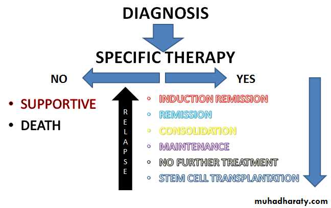 Specific treatmentUsed of cytotoxic chemotherapy. Aim : To induce remission (absence of any clinical or conventionallaboratory evidence of the disease) To eliminate the hidden leukemic cells
