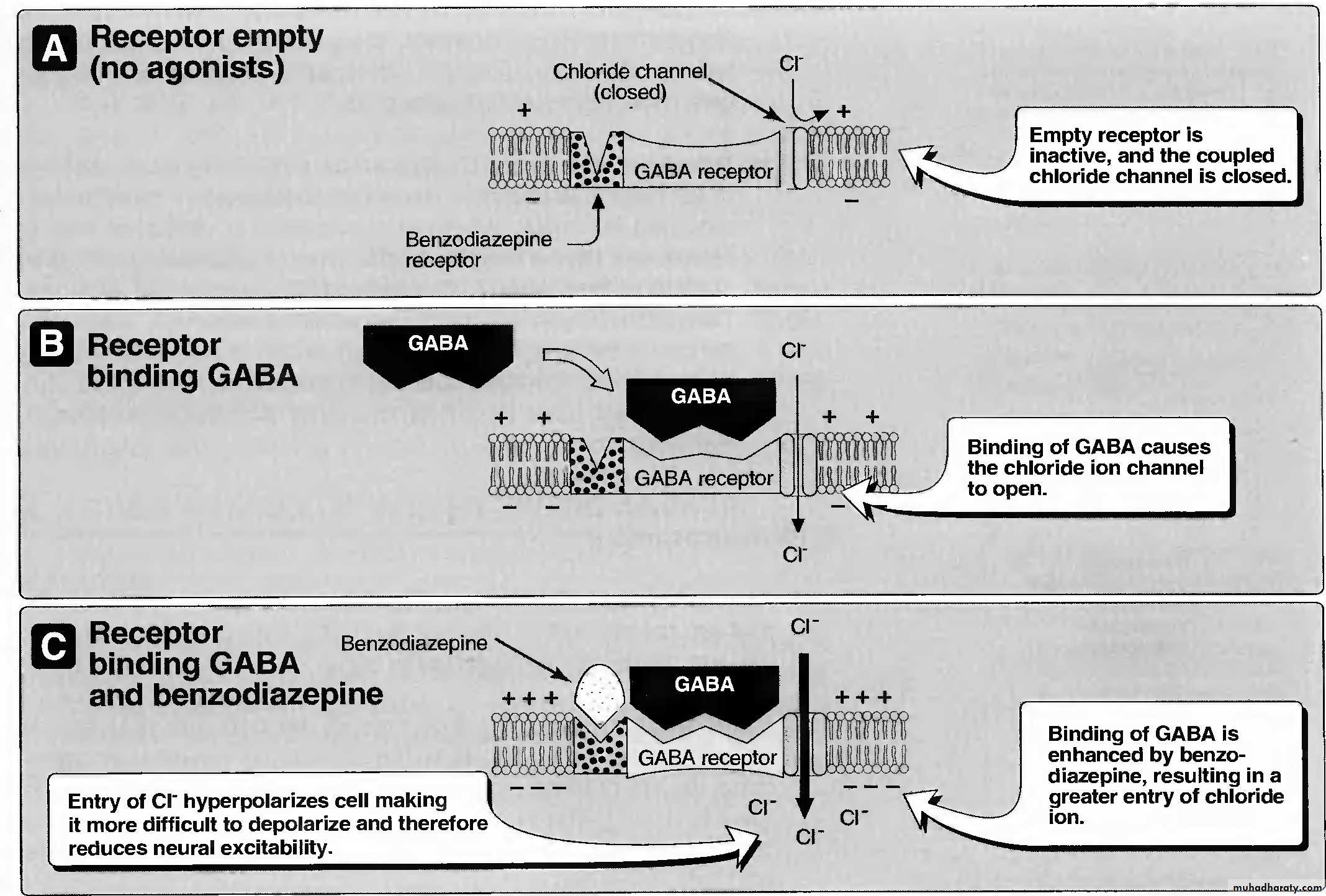 The target for Benzodiazepines actions are the of γ-aminobutyric acid (GABA). Binding of GABA to its receptor on the cell membrane triggers an opening of a chloride channel, which leads to an increase in chloride conductance. The influx of chloride ions causes a small hyperpolarization that moves the postsynaptic potential away from its firing threshold and thus inhibits the formation of action potentials. Benzodiazepines bind to specific, high affinity sites on the cell membrane, which are separate from but adjacent to the receptor for GABA. The benzodiazepine receptors are found only in the central nervous system (CNS), and their location parallels that of the GABA neurons. The binding of benzodiazepines enhances the affinity of GABA receptors for this neurotransmitter, resulting in a more frequent opening of adjacent chloride channels. This in turn results in enhanced hyperpolarization and further inhibition of neuronal firing.Actions