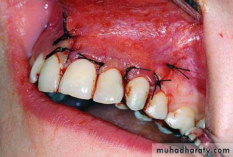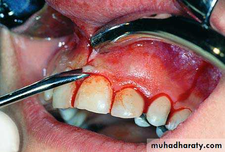The incision for creation of the flap begins at the first or second ipsilateral premolar and,after continuing along the cervical lines of the teeth, ends at the first premolar on the contralateral side