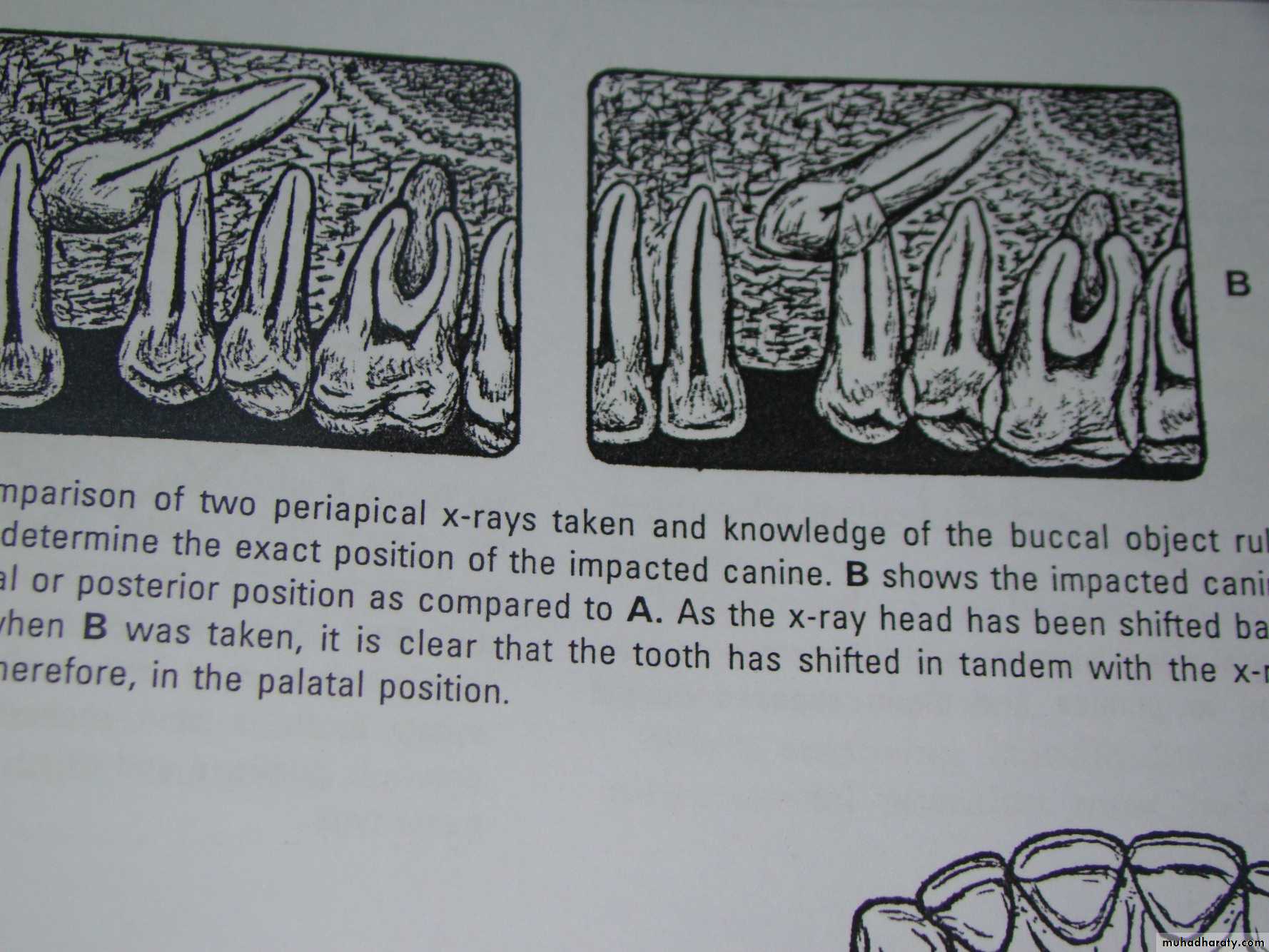 The relative radiopacity of the crown of the impacted canine may assist in the determination of the tooth position (the more radiopaque lie palataly )