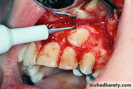 The initial stage of the operation is to reflect the mucoperiosteum and to remove the bone overlying the tooth to expose the greatest coronal diameter, the incisal edge and the cingulum .