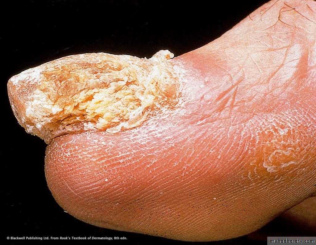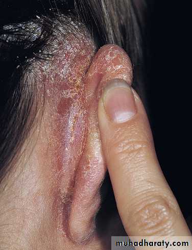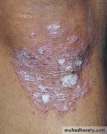 The deep red, smooth, glistening plaques may extend ‎to and stop at the junction of the skin folds, as with intertrigo or Candida infections. The ‎surface is moist and contains macerated white debris. Cracking and fissures are common at the ‎base of the crease.