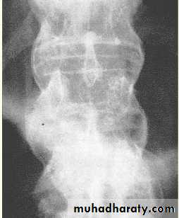 gradual ossification of the annulus fibrosus and eventual “bridging” between vertebrae by syndesmophytes. result in a virtually complete fusion of the vertebral column (“bamboo spine”).