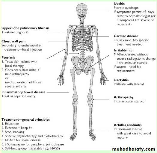 Coexisting disease in the lumbar spine often contributes significantly to disability of the lower extremities. Hips and shoulders are involved at some stage of disease in up to 35% of patients.