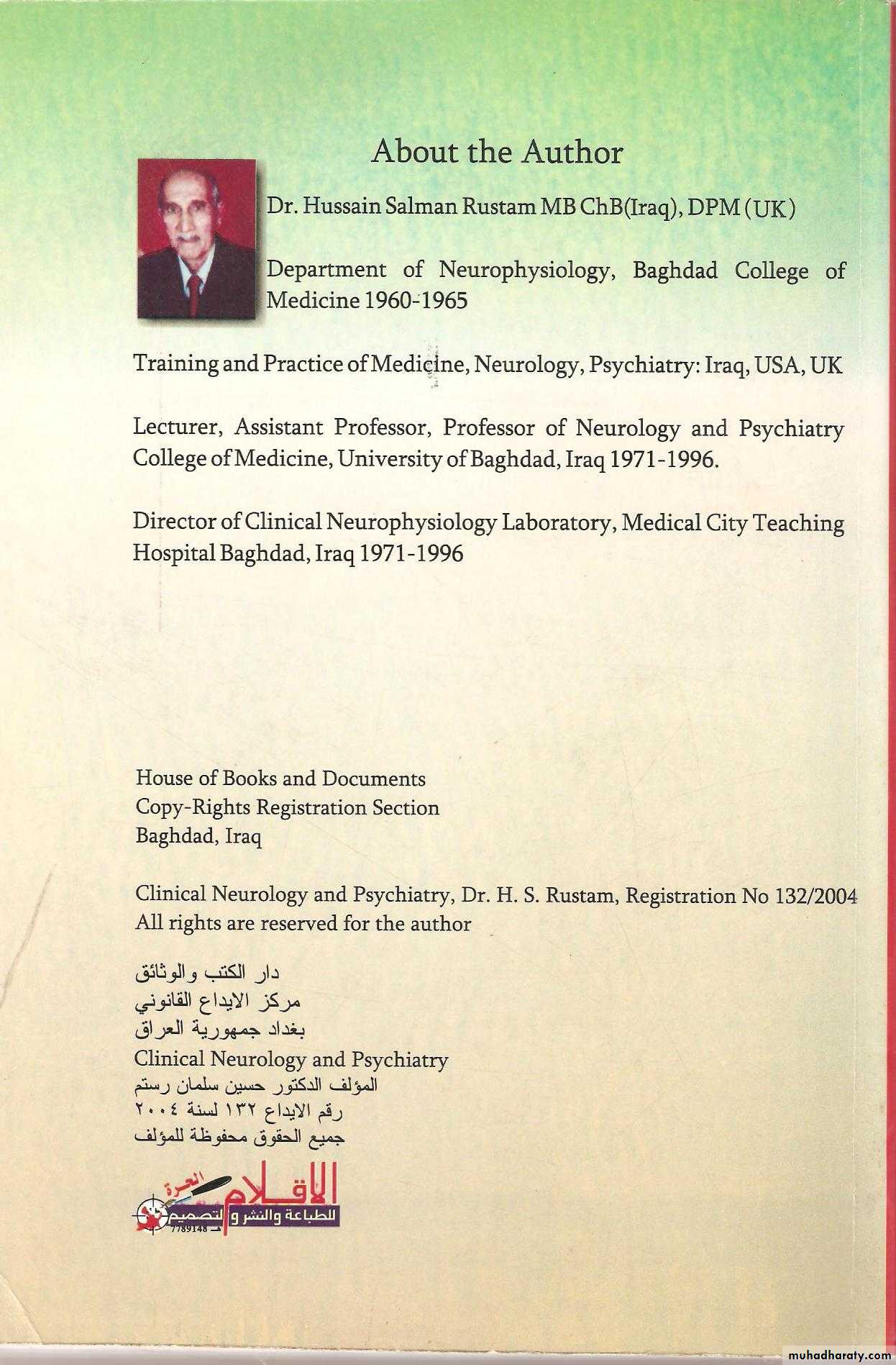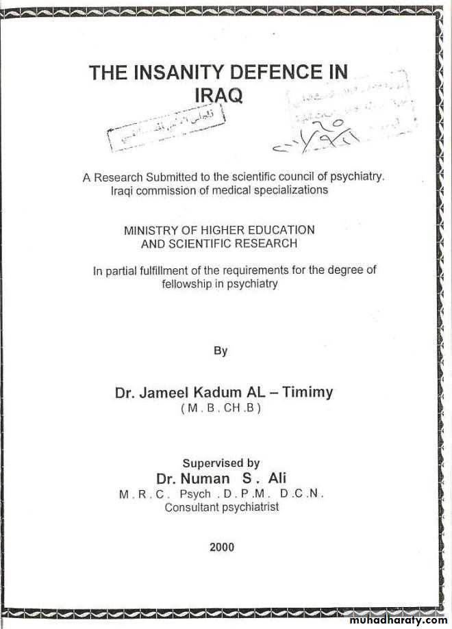 Rustam H. Clinical Neurology and Psychiatry. House of Books and Documents, Baghdad, Iraq. 2008: 475.Al-Timimi, J. K. (2000) The Insanity Defence in Iraq. A thesis submitted to the scientific council of psychiatry in partial fulfillment for the degree of fellowship of the Iraqi commission for medical specialization in psychiatry. (non-published thesis).