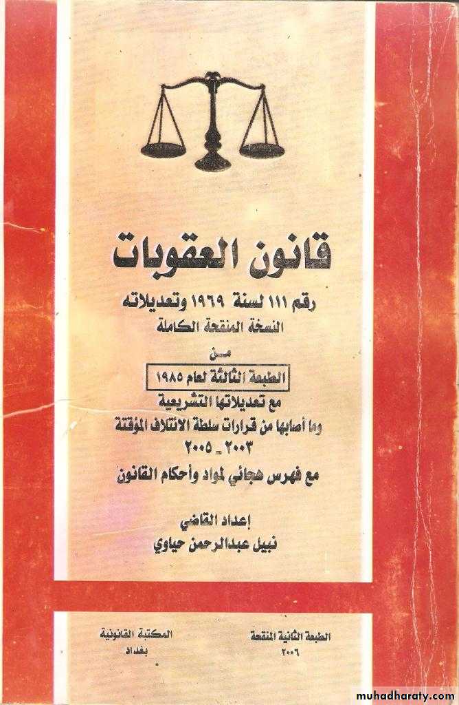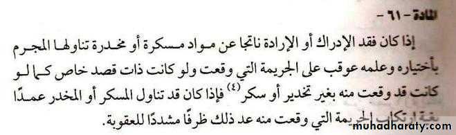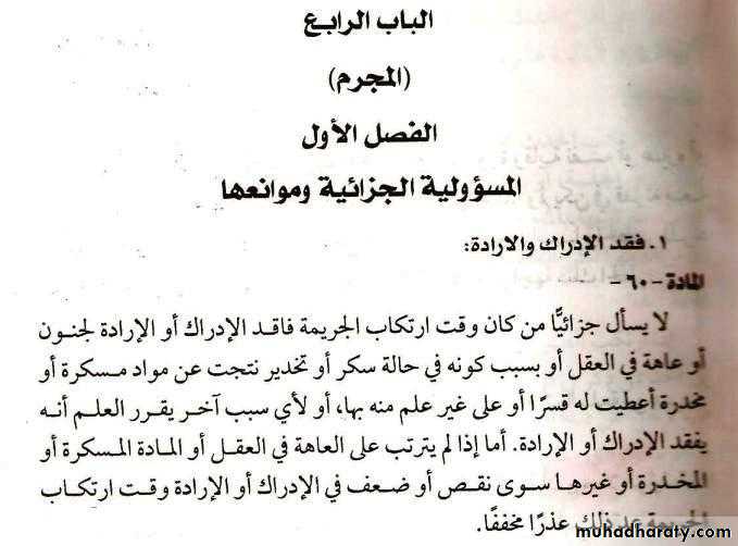 The scope of forensic psychiatry can be broadly defined as those areas where psychiatry interacts with the law. The Iraqi "civil code" قانون الأحوال الشخصيّة contains details about psychiatric illness and things like: writing a will, divorce, custody وصاية of children, etc..In the Iraqi "criminal codes" قانون العقوبات regard the complete absence of will الإرادة and perception الإدراك as a cause for "not guilty by reason of insanity", and the partial absence of will and perception as "reduced responsibility". And regard subjects who were forced to drink alcohol or other mind-altering substance and then committing a crime as "not guilty", while those who took alcohol or other mind-altering substance and then commit a crime as "guilty".