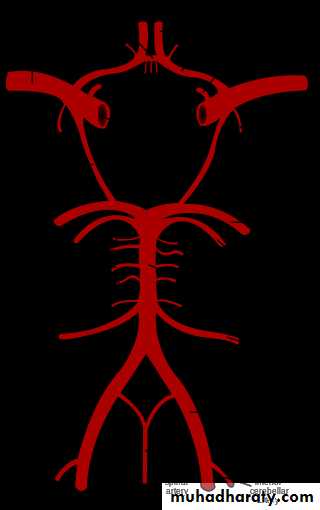 The main arterial supply of the brain comes from the internal carotid arteries, which supply the anterior brain, and the vertebral and basilar arteries (vertebrobasilar system), which provide the posterior circulation. The anterior and middle cerebral arteries supply the frontal and parietal lobes, while the posterior cerebral artery supplies the occipital lobe. The vertebral and basilar arteries perfuse the brain stem and cerebellum; Communicating arteries provide connections between the anterior and posterior circulations and between left and right hemispheres, creating protective anastomotic connections that form the circle of Willis.