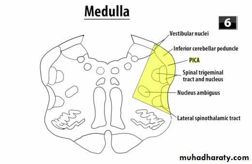Cross signs (ipsilateral cranial nerve plus contralateral weakness or sensory loss) eg:Posterior inferior cerebellar artery occlusion(PICA): results in the lateral medullary (Wallenberg) syndrome . This syndrome varies in its presentation with the extent of infarction, but it can include ipsilateral cerebellar ataxia, Horner syndrome, facial sensory deficit and dysphagia ; contralateral impaired pain and tempreture.The motor system is characteristically spared because of its ventral location in the brainstem.