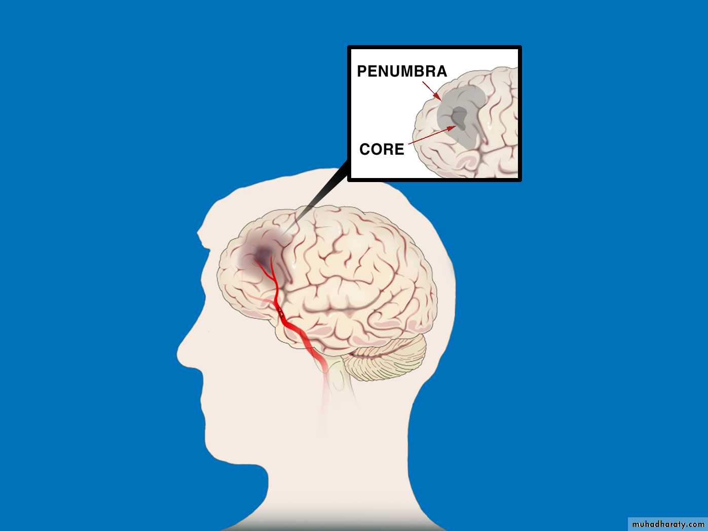 At the centre of an infarct the damage is most severe but at the periphery collateral flow may allow continued delivery of blood, although at a lower rate. This zone may become dysfunctional secondary to electrical failure although not dead and is referred to as the ischaemic penumbra, Once blood flow falls below the threshold for the maintenance of electrical activity, neurological deficit develops. At this level of blood flow the neurons are still viable; if the blood flow increases again, function returns; However, if the blood flow falls further, irreversible cell death occure.