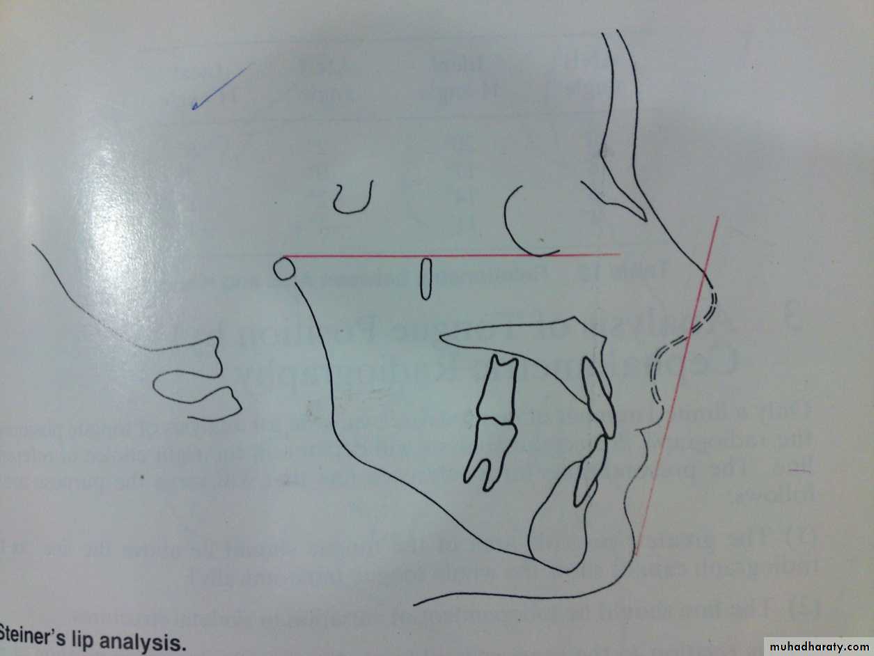 2- Steiners lip analysis:Reference line is center of (S) shape between tip of nose and upper lip and soft tissue pog.
