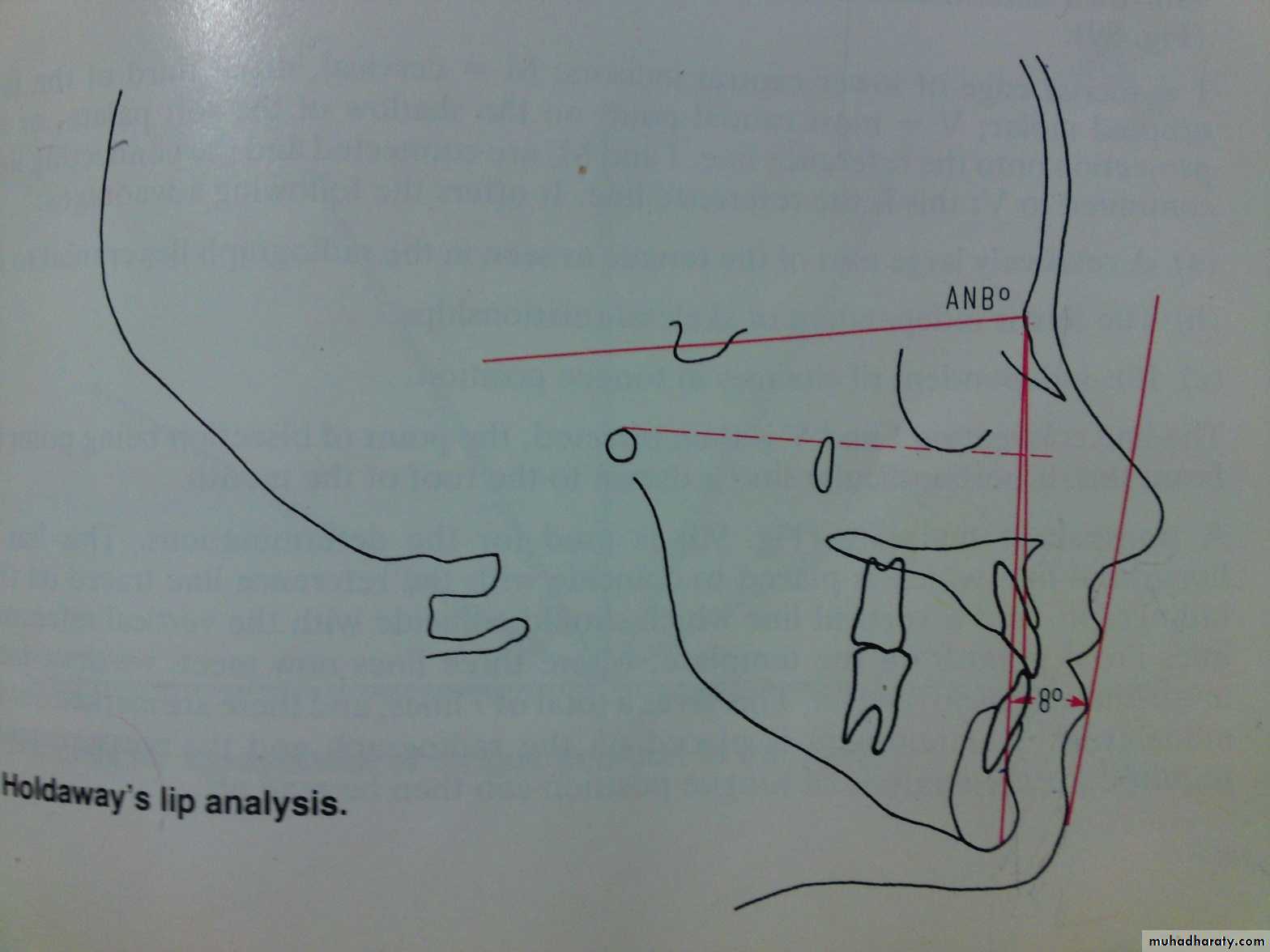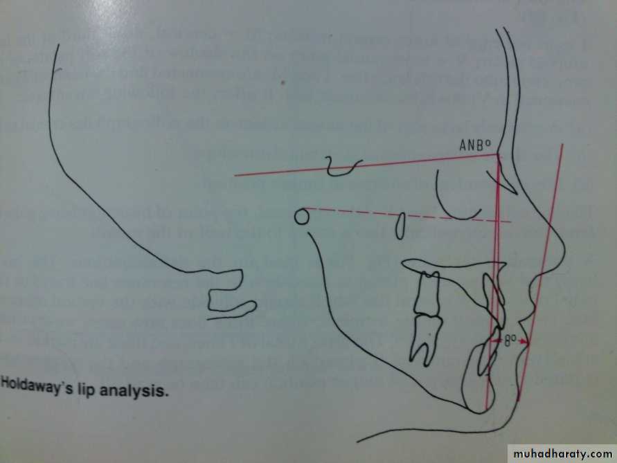 Holdaways lip analysis:Angle between a tangent to the upper lip and the NB line (H angle)