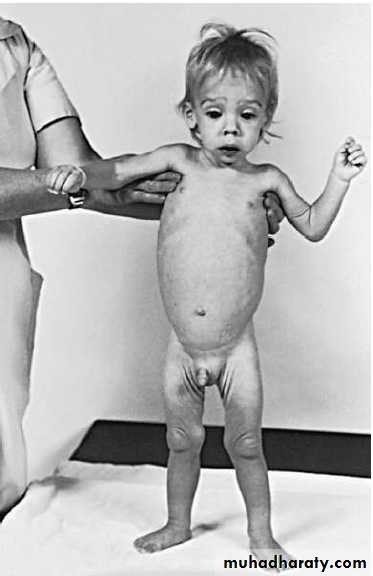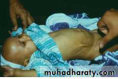 Depending on severity, the infant with FTT may exhibit thin extremities, a narrow face, prominent ribs, and wasted buttocks. Neglect of hygiene may be evidenced by diaper rash, unwashed skin, untreated impetigo, uncut and dirty fingernails, or unwashed clothing. A flattened occiput with hair loss may indicate that the child has been lying on his or her back. This flattening may be due to being unattended for prolonged periods. Delays in social and speech development are common. Other findings may include an avoidance of eye contact, an expressionless face, hypotonia, and the absence of a cuddling response.