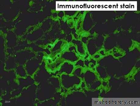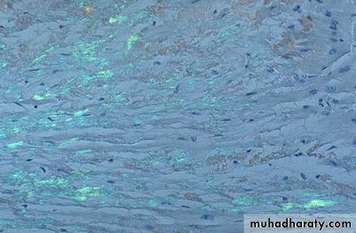 Diagnosis of amyloidosis is by a special stain for amyloidosis (like Congo red, Lugol’s iodine, Immunofluorescent stain), electron microscopy.● Congo red staining results in bright green fluorescence/birefringe apple green color when viewed under special microscope (containing polarized light).