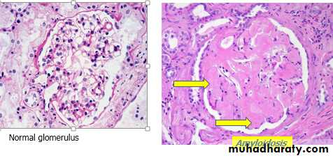 Kidney: Histologically amyloid is deposited primarily in the glomeruli (widening of the mesangial matrix with homogenous, structureless material + thickening of basement membrane).