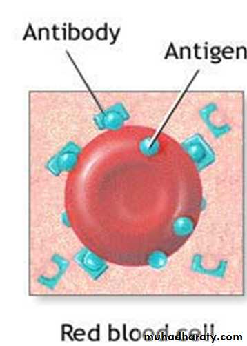 a- Autoimmune hemolytic anemia: There are auto-antibodies against the RBC-antigens. These auto-abs are of IgG or IgM type. Both can activate the complement and result in RBCs lysis or alternatively, IgG may opsonize the RBCs to be engulfed by the phagocytic cells in the spleen & liver.