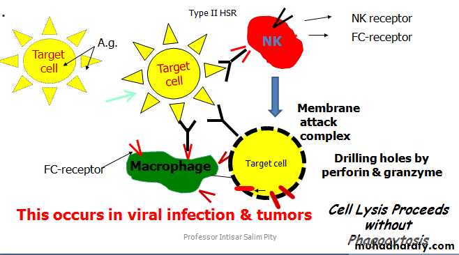 2. Antibody dependent cellular cytotoxicity in which the antibody molecule provides a link between the natural killer cell (or macrophage) and the Ag on the surface of the target cell without phagocytosis & without activation of complement →Drilling holes by perforin & granzyme .