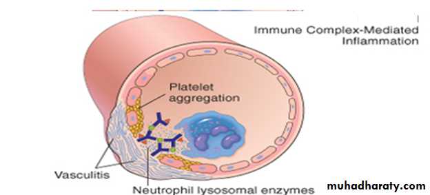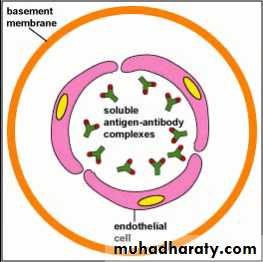 2. Ag-ab complexes + activated complements in neutrophil emigration & cause vasodilatation and increased vascular permeability (i.e. acute inflammation). The end result will be tissue (endothelial) damage.
