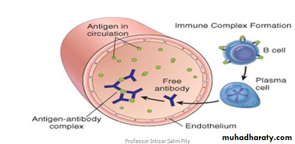 ● Acute post-streptococcal glomerulonephritis which develops 1-2 weeks following throat infection. The streptococcal antigens pass into the blood, then antibodies develop against them and react to form the ag-ab complexes which precipitate on the basement membrane of the glomerular capillaries. These complexes will activate complement components and cause the inflammation (vasculitis) & endothelial damage. The patient presents clinically with hematuria and oliguria.Examples of systemic HSR III
