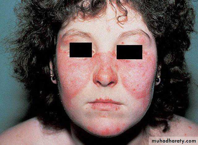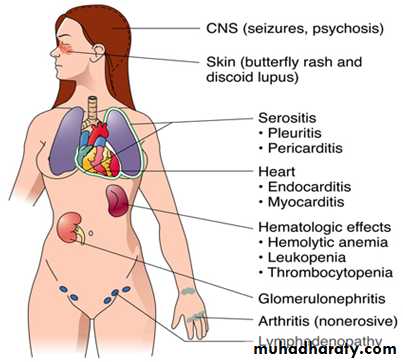 ● It results from auto-antibodies against nuclear components (DNA, histones, etc.). These are normally sequestered inside the nucleus where they are hidden from the antibodies, but they are released following tissue injury; e.g., a viral infection and are quickly bound by the patient own antibodies.● The antigen-antibody complexes will deposit in the basement membranes of the glomeruli, lungs, joints, skin, lymph nodes…etc, where they induce complement fixation, inflammation & tissue damage