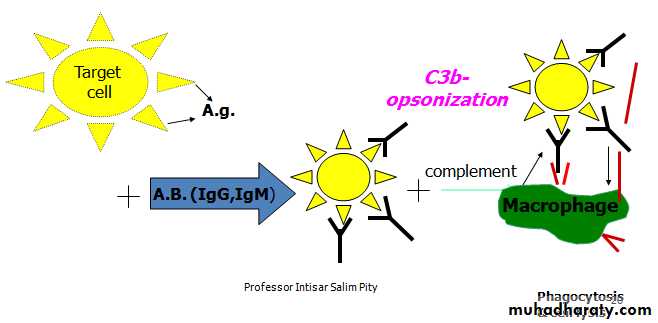 The antigen is on the surface of cells + Ab →→ Ag-Ab reaction may be one of three effects:1- Complement dependent HSR (opsonization & phagocytosis)
