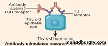 c. Grave’s disease: Here the antibodies formed against TSH receptor of thyroid epithelial cells themselves act as TSH leading to continuous thyroid stimulation with a resultant thyrotoxicosis.