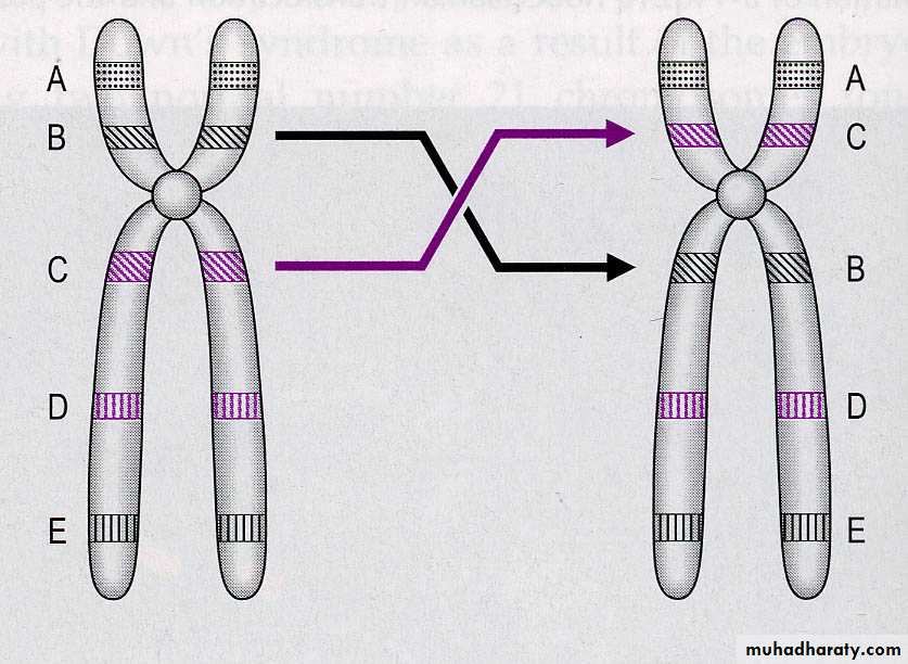 • Translocation (t):which implies transfer of a part of one chromosome to another.