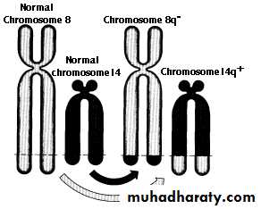 Robertsonian translocation, occurs between acrocentric chromosomes in most of which the breaks occur close to the centromere, affecting the short arms of both chromosomes. Transfer of the segments leads to one very large chromosome & an extremely small one which will be lost & the carrier will have 45 chromosomes. Such loss is compatible with survival.