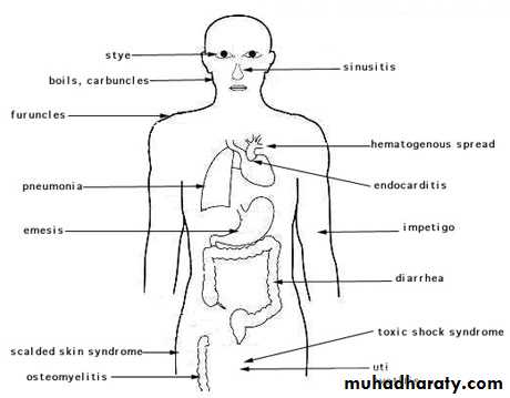4. Toxic shock syndrome : it is fatal multi systemic disease and could be associated with menstruation or not associated with menstruation. Toxic shock syndrome is manifested by an abrupt onset of high fever, vomiting, diarrhea, myalgias, rash, and hypotension with cardiac and renal failure in the most severe cases. It often occurs within 5 days after the onset of menses in young women who use tampons, but it also occurs in children or in men with staphylococcal wound infections.5. S. aureus also cause bactermia,endocarditis, meningitis, osteomylitis and pneumonia.