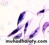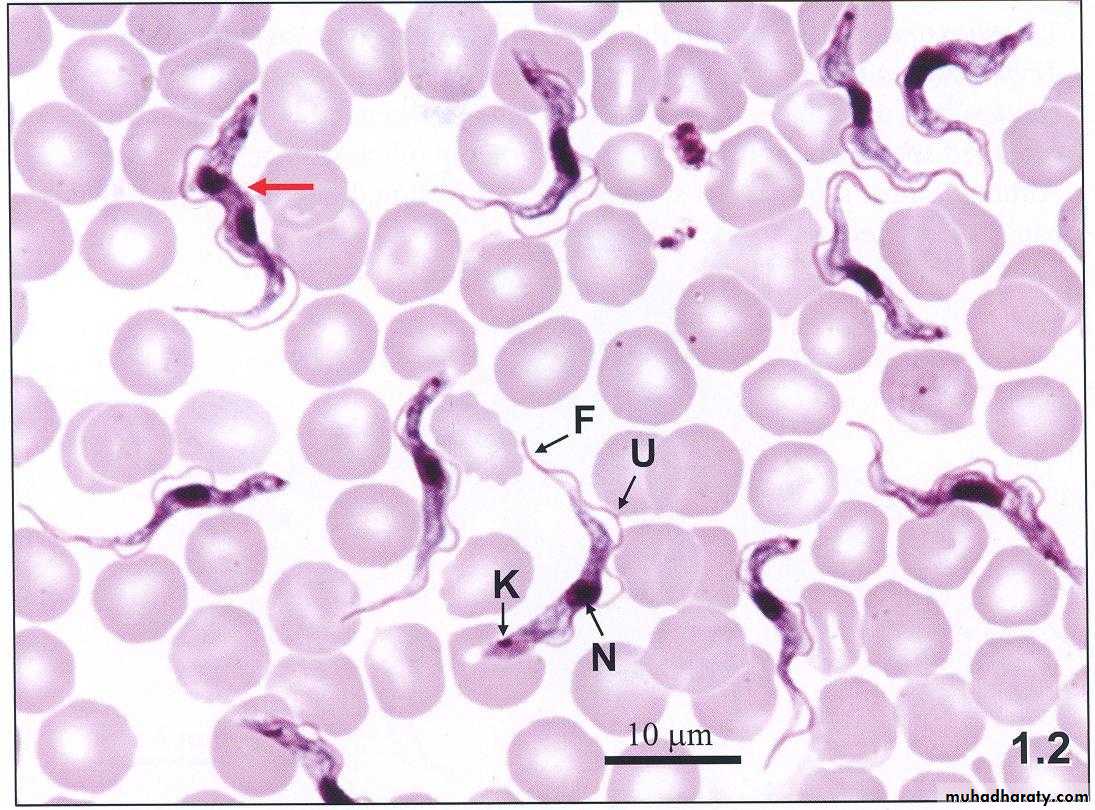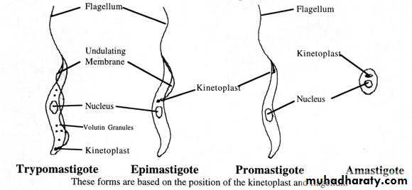 Elongated form, 15-20 microns long and slightly wider than promastigote, nucleus near middle, kinetoplast is anterior to the nucleus. From blepharoplast flagellum arise forming the undulating membrane extending half of the body length, and project from the anterior end as a free flagellum.4-Trypomastigote (Trypanosome) form