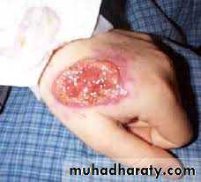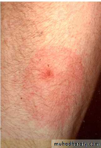 red papule at the bite site, usually on an exposed extremity multiple satellite nodules that coalesce and ulcerateif cell-mediated immunity does not develop, the lesions can spread to involve large areas of skin.