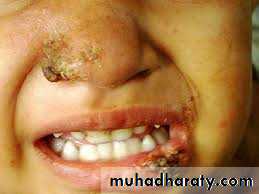 Mucocutaneous leishmaniasis begins with a papule at the mucocutaneous junction of the nose and mouth. Disfiguring granulomatous.