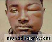The acute phase of Chagas’ disease consists of facial edema and a nodule (chagoma) near the bite, coupled with fever, lymphadenopathy, and hepatosplenomegaly.A bite around the eye can result in unilateral palpebral swelling & conjuctuvitis ( Romana’s sign).