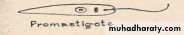 blepharoplast and parabasal body beside it) lies at right angle to the nucleus. This form (amastigote) has no flagellum.
