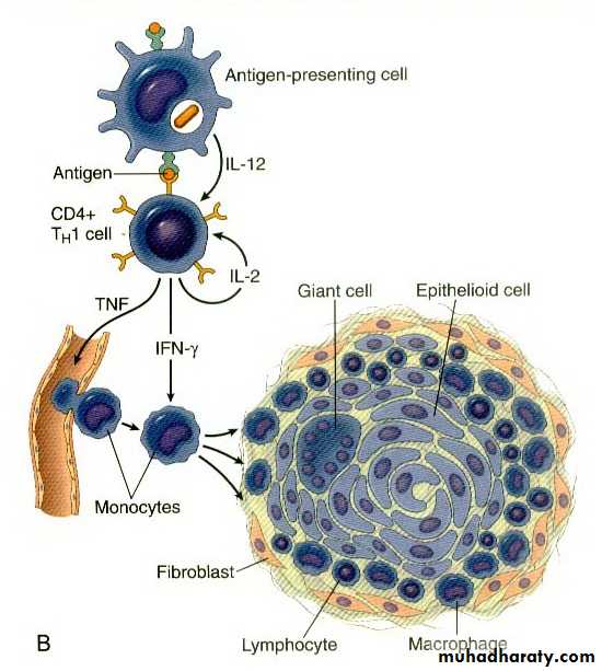 IgG antibodies detected in granular pattern by immunoflourescenceCell mediated (type IV) hypersensitivity : the antigen presented by dendritic cell ( antigen presenting cell) leads to activation of TH1 cell which secrete cytokines that activate macrophages to form epitheliod cells & granuloma.