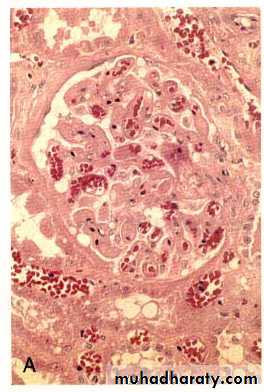 a glomerulus with subendothelial deposites of immune complexes (PAS stain)