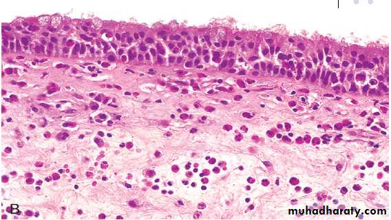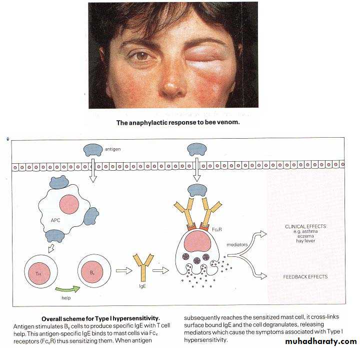 Type I hypersensitivity reaction: a cross linking of IgE antibodies on the surface of mast cells following re exposure to the antigen leading to degranulation of mast cells & release of mediators of inflammation.Chronic inflammation due to type I hypersensitivity reaction: Nasal mass with edematous stroma with chronic inflammatory cell infiltrate ( mainly eosinophils) covered by ciliated columnar epitheliumDiagnosis: allergic nasal polyp.