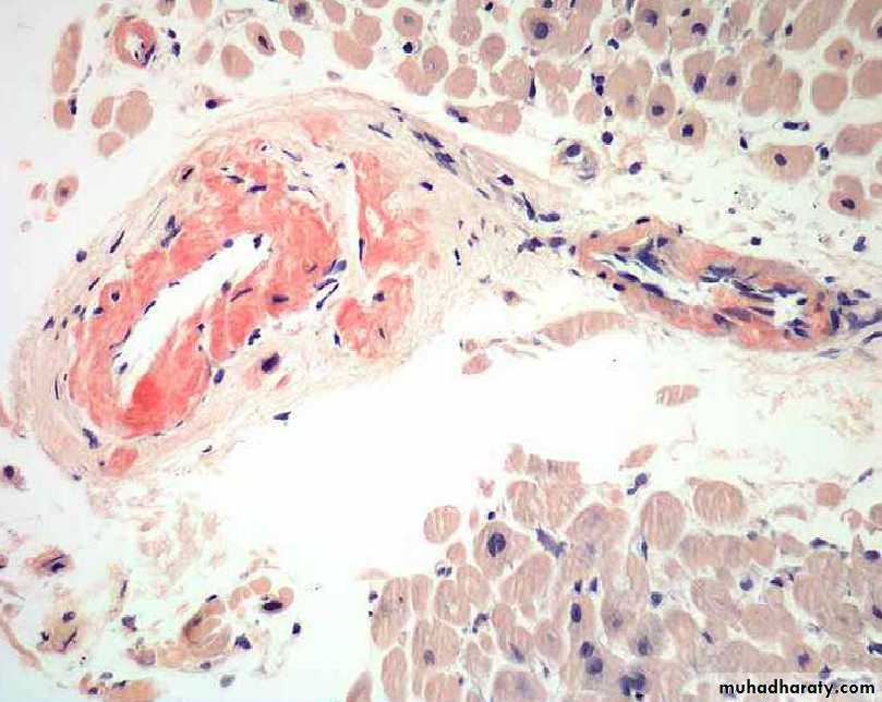 In the heart, amyloid deposits begin to accumulate within the myocardium between muscle fibers & in the wall of blood vessels as seen by H&E as amorphous eosinophilic hyaline (right) & congo red stains as red deposits (left)H&E stain