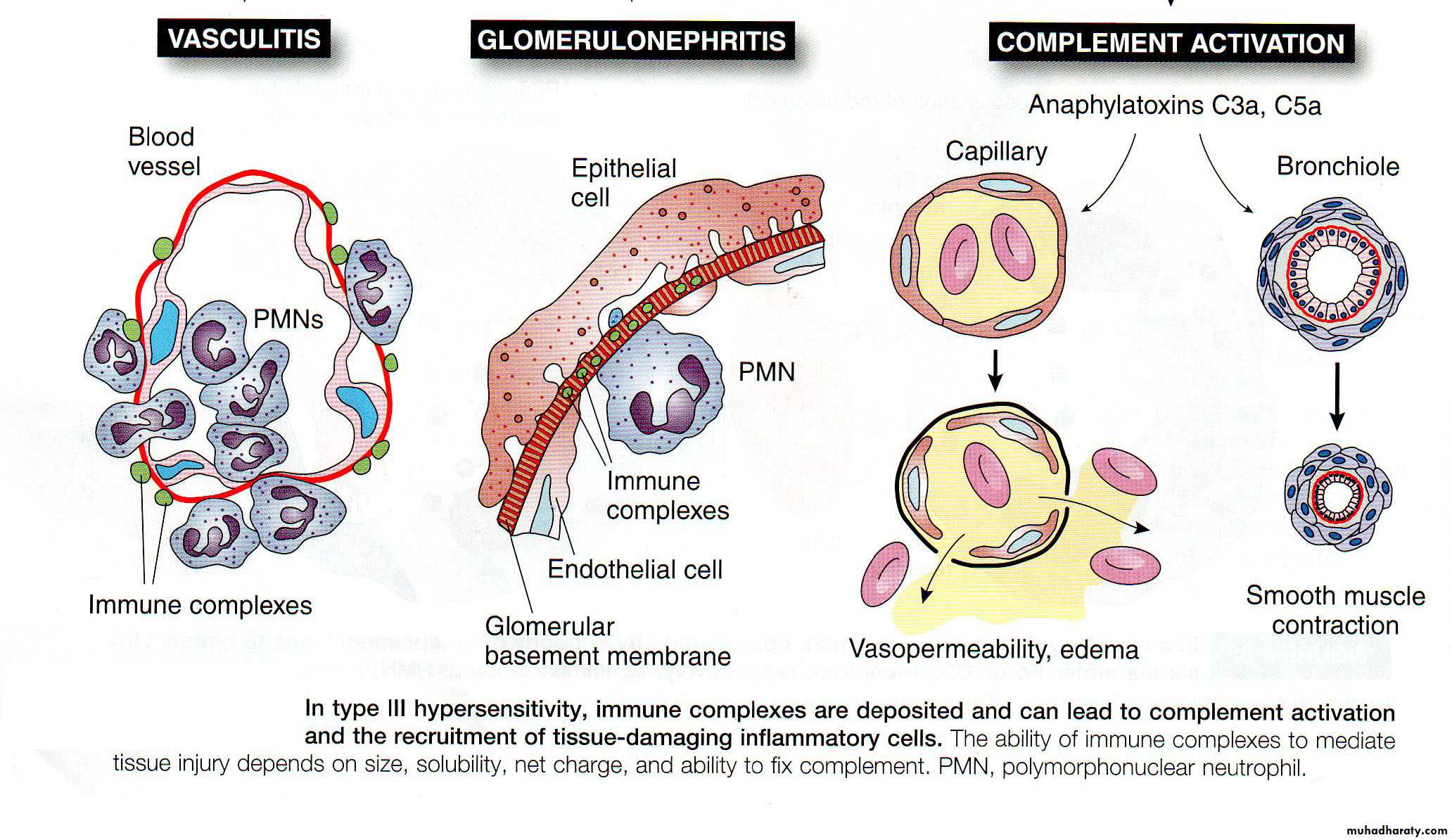 Immune complex mediated (type III) hypersensitivity : the pathologic reaction is initiated when antibodies combine with circulating or fixed antigens & then deposited in the vessel wall & basement membranes producing local inflammation