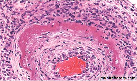 The deposition of immune complexes in an artery is called vasculitis with circumferential bright pink area of fibrinoid necrosis with protein infiltration & inflammation
