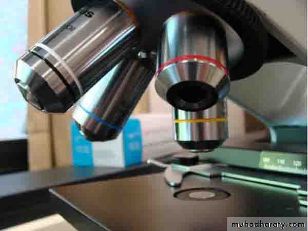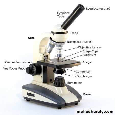 - A basic microscope consists of two lenses. The uppermost lens, called the ocular lens which is the part through which a person looks. The lower lens is the objective lens. Usually, several objective lenses are localized on a turret, allowing rapid changing of objective lenses. The eyepiece tube holds the ocular and objective lenses in place. Most microbiological specimens are mounted on glass slides and placed on the stage.Procedure :