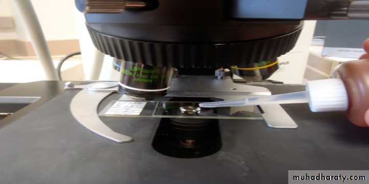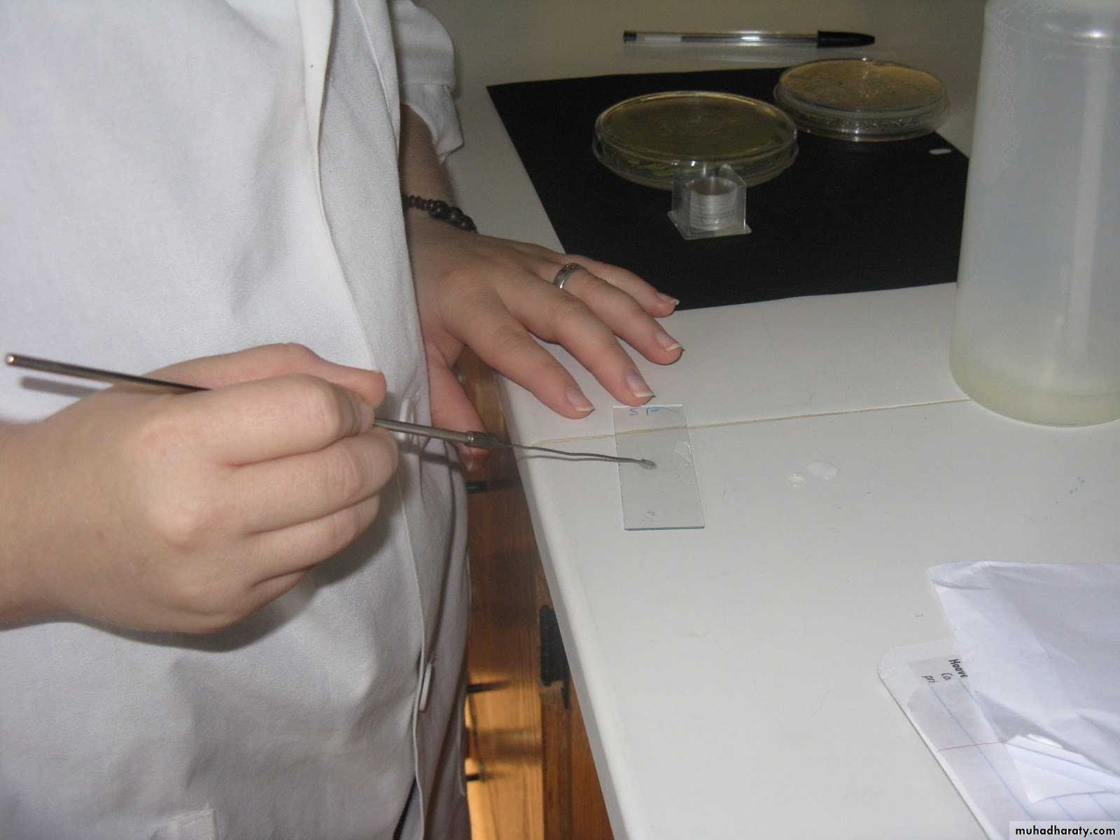 1 - Sterilize the loop in benzene flame and let it to cool.2 - Place a loopful of a clean water ( tap water can be used ) on the center of a clean slide.