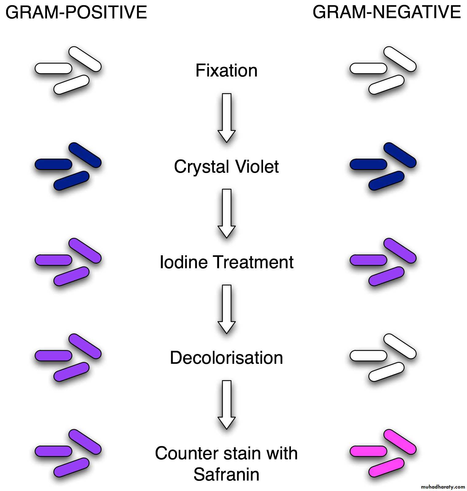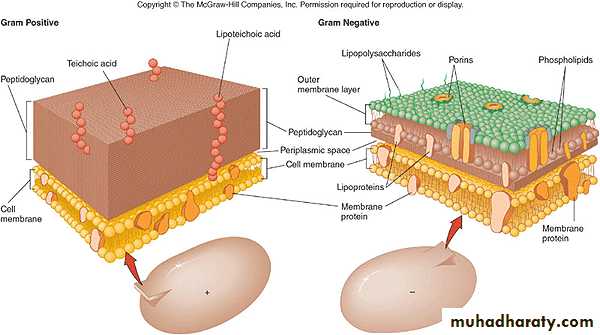 The division of bacteria into two categories, indicates a basic chemical differences between gram positive and gram negative bacteria. The most important differences are:1 - The cell wall of Gram-negative organisms have relatively little peptidoglycan and mainly consist of lipoproteins and polysaccharides. While in Gram positive organisms the peptidoglycan comprises the major part of the cell wall rendering them more rigid than Gram negative cells and less permeable for the dye iodine complex to diffuse freely out of the cell during the process of decolourization.