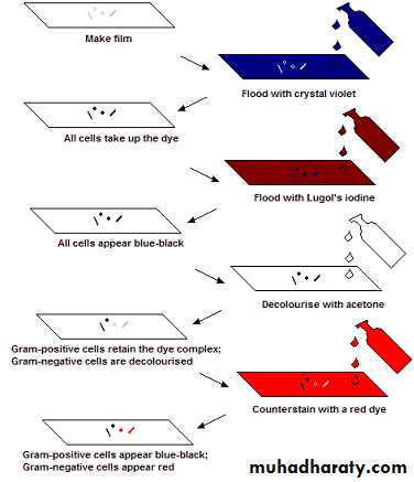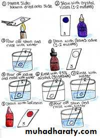 1 - Flood the slide with crystal or gention violet,leave to act for 1-2min. ,wash with tap water.2 - Apply gram's iodine (a mordant),leave to act for one minute ,wash with tap water.