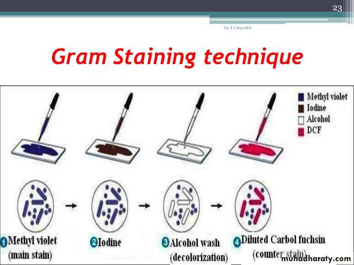 B.Differentional (compound) staining technique:- It consists of more than one dye used successively to identify organisms according to their type of reaction.