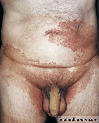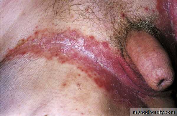 The lesions are most often unilateral (unlike candida) and begin in the crural fold.