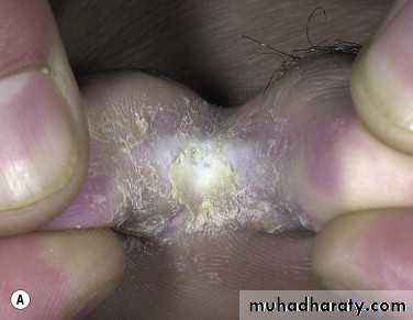 The infection occasionally migrates to the buttock and gluteal cleft area.