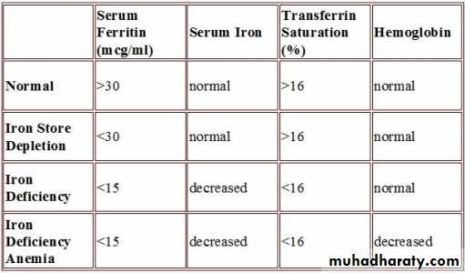 • • S. ferritin < 20 ug/l is diagnostic of iron deficiency anemia,