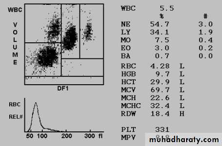 • 3- Hemoglobin Electrophoresis decreased Hb A2 percentage.