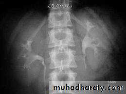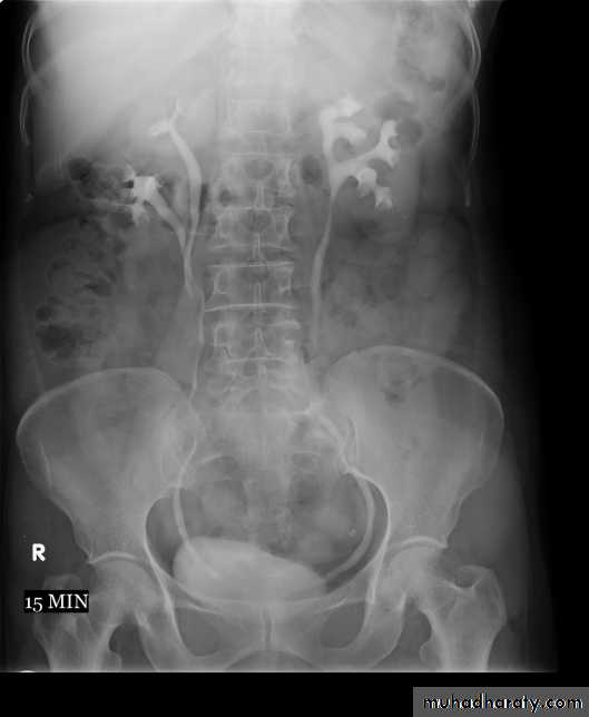 Large volume of CM (50-100mi) is injected intravenously passes to glomerular filtrate concentrated in renal tubules passes to-pelvicaticeal systems ---ureters---bladder.