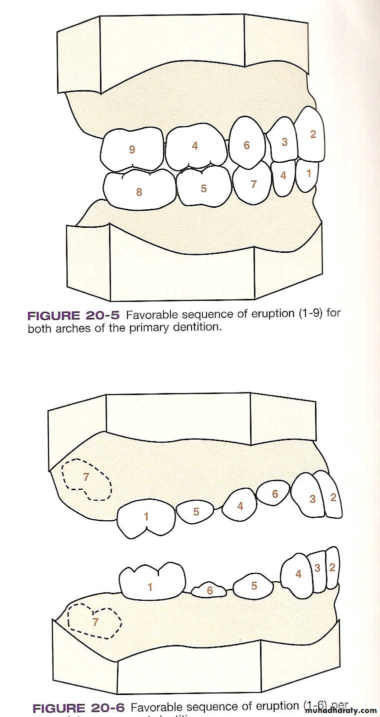 The canines in the upper arch erupt only after the premolars have replaced the deciduous molars, whereas the canine erupt before the premolars in the lower arch.fourth: Second Transitional Period